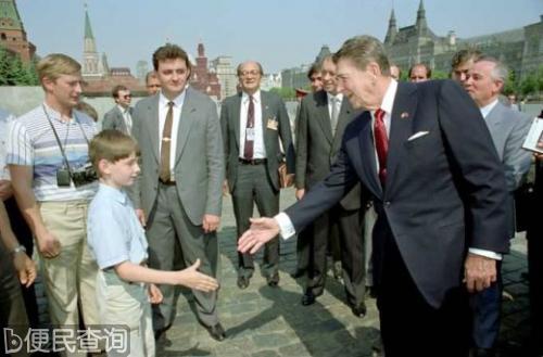 1988年5月,在苏联莫斯科红场,里根正与一位少年握手。拍摄该照片的美国总统专职摄影师皮特表示,脖子上挂着相机,站在少年背后的男子正是当时苏联国家安全委员会(KGB)的要员、俄罗斯现任总理普京。