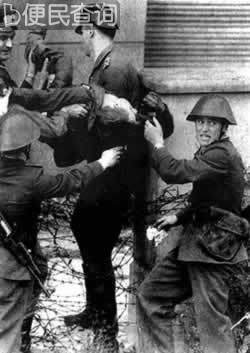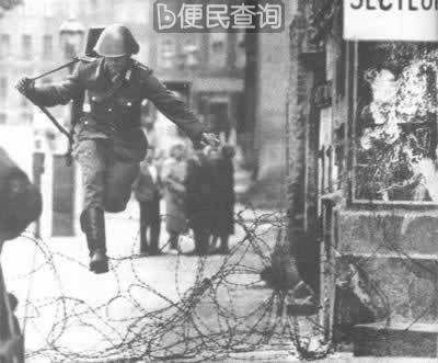 1961年8月13日凌晨,在铁丝网网成的柏林墙即将封闭的一瞬间,一个参与围墙行动的东德士兵突然跳越铁丝网,投奔西德一方